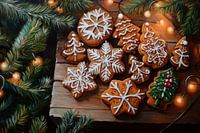 Een verleidelijk feest van smaken en kleuren wacht op de kijker: peperkoek in winterse vormen, kunstig versierd met suikerglazuur, ligt op een rustieke houten plank. Omringd door gloeiende lichtjes en groene sparrentakken, stralen ze gezelligheid uit voor Kerstmis en nodigen ze je uit om je onder te dompelen in een zoete traditie.