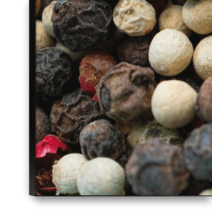 In dit werk zie je vier seizoenen peperkorrels, samengebracht in één beeld waarin kleur, vorm en textuur centraal staan. Zwarte, witte, groene en rode peperkorrels vormen samen een rijk palet van tinten en structuren. Elke korrel heeft zijn eigen karakter: glad, gerimpeld, mat of licht glanzend. Door de close-up benadering worden ook de…