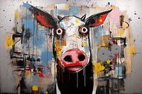 Dit fascinerende digitaal geschilderde kunstwerk presenteert een dierlijke figuur waarvan de identiteit de toeschouwer in verwarring kan brengen. De heldere rode en roze tinten suggereren elementen van een varken, terwijl de bouw en expressie van het gezicht herinneringen aan een koe oproepen. Het gebruik van abstracte penseelstreken, krabbels en diverse kleurensplashes draagt bij aan het gevoel van mysterie en onvoorspelbaarheid. De contrasterende kleuren en texturen nodigen uit tot nader onderzoek, waardoor de kijker wordt aangemoedigd om te speculeren en te interpreteren. Het werk speelt met de perceptie van de beschouwer en daagt hen uit om verder te kijken dan het oppervlak.