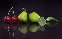 Stillevens van groene peren en rode kersen tegen een donkere achtergrond