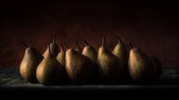 Stilleven met stoofperen in een donkere setting zoals bij de oude meesters. De eenvoud, de compositie en het natuurlijke avondlicht in combinatie met de kleurstelling vormen een fraai rustiek geheel. Een tijdloze foto voor elke keuken.