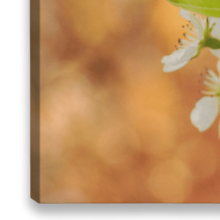 Een foto gemaakt in mijn tuin in Frankrijk van een tak van de Perenboom. De oranje achtergrond is van een struik waar de zon op scheen. De bloesem komt op deze manier mooi naar voren.