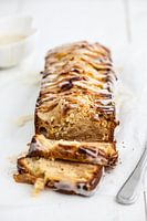 Perencake met glazuur op een lichte, witte houten ondergrond.