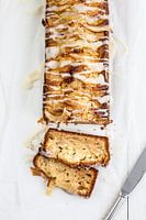 Perencake met glazuur op een lichte, witte houten ondergrond.