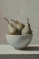 Perenstilleven | Quiet Afternoon Delight - Dit stilleven schilderij toont een serene compositie van vier rijpe peren met een gespikkelde, groengele huid rustend in een eenvoudige, lichtgrijze keramieken kom, gepositioneerd tegen een subtiel bewerkte, lichtgrijze achtergrond.