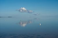 Tijdens ons verblijf op Terschelling maakte ik nog een laatste fietstocht langs de Waddenzee. Ik was blij verrast toen ik zag dat juist op deze dag het windstil was en daardoor de Waddenzee een gladde spiegel leek. Het was onwezenlijk en juist het kleine wolkje laat een perfecte reflectie zien in het water.