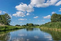 Mooi! Blauwe lucht, blauw water, groene oevers, witte wolkjes, alles klopt aan dit plaatje met enorm veel weerspiegeling in het water!