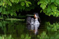 Great crested grebe with young. I waited for the right moment for them to be framed by all the green leaves.