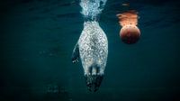 Een zeehond drijft in het water en heeft alleen zijn kop boven het water om op periscoopdiepte rond te kijken. Verder zwemt hij rond en speelt misschien ook wel met de drijvende bal die naast hem ligt. Ik denk dat dit een speelgoed is. Het ziet er een beetje abstract uit, maar je kijkt hier van onderen naar het dier en de reflectie van…