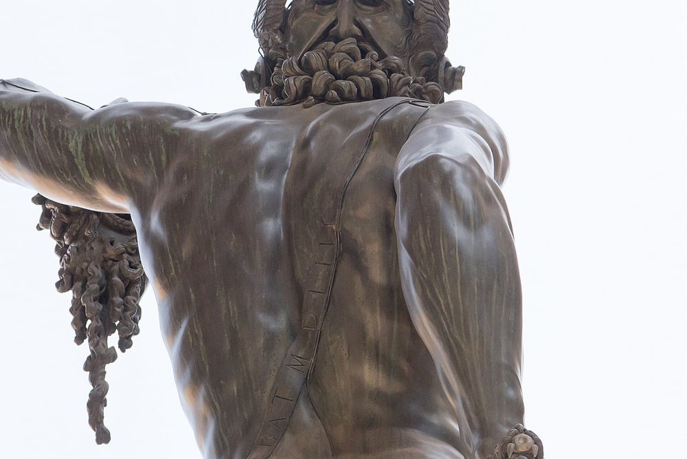 The subject matter of the work is the mythological story of Perseus beheading Medusa, a hideous woman-faced Gorgon whose hair had been turned to snakes; anyone who looked at her was turned to stone. Perseus stands naked except for a sash and winged sandals, triumphant on top of the body of Medusa with her head, crowned with writhing snakes, in his raised hand. Blood spews from Medusa's severed neck. The bronze sculpture, in which Medusa's head turns men to stone, is appropriately surrounded by three huge marble statues of men: Hercules, David, and later Neptune. Cellini's use of bronze in Perseus and the head of Medusa, and the motifs he used to respond to the previous sculpture in the piazza, were highly innovative. Examining the sculpture from the back, one can see a self-portrait of the s