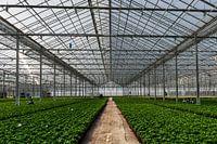 Mooi lijnenspel in een plantenkas. De glazen panelen en de planten geven een mooi plaatje