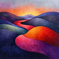 Peru Kunst | Waves of Whispered Secrets - Dit abstracte landschap schilderij verbeeldt een kleurrijk golvend landschap dat mogelijk de iconische heuvelachtige gebieden van Peru reflecteert, waarbij elke lijn en kleur een eigen verhaal lijkt te vertellen.