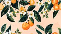 De diepe groene bladeren vormen een prachtig contrast met de warme tinten van de sinaasappels en de zachte roze achtergrond, wat een gevoel van…