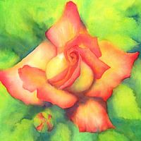 Koop dit bloemen kunstwerk Perzik Roos aquarel schilderij vierkant van Karen Kaspar op canvas, aluminium dibond, (ingelijste) fotoprint, behang en ArtFrame, op maat geprint in Fine-Art kwaliteit.