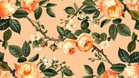 De illustratie toont verschillende soorten rozen, variërend van volledig geopende bloemen tot knoppen die op het punt staan te ontluiken. De kleurenpalet is warm, met tinten van perzik, crème, en zacht oranje, die prachtig contrasteren met de donkergroene bladeren en takken. Deze kleurencombinatie creëert een gevoel van zachtheid en warmte, en nodigt de kijker uit om zich te verliezen in de serene schoonheid van de natuur. De achtergrond, een subtiele roze tint, versterkt de uitstraling van de bloemen en zorgt voor een harmonieuze compositie.
