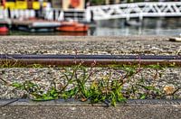 Een klein plantje, Persicaria maculosa oftewel Perzikkruid, groeit dapper tussen het beton en staal van de rails en stelconplaten op de kade van de Leuvehaven in Rotterdam.