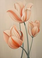 Perziktulpen - Dit subtiele beeld toont een trio van gestileerde tulpen in rustige perzikkleurige tinten, elegant contrasterend met het zachte, neutrale achtergrond. De vloeiende lijnen en zachte schaduwen geven een organisch gevoel, terwijl het algehele ontwerp neigt naar een moderne interpretatie van natuurlijke…