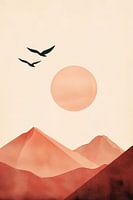 Een minimalistisch landschap in warme terracotta tinten toont majestueuze bergen onder een zachte, perzikkleurige zon. Twee sierlijke vogels zweven in de lichte hemel, wat een gevoel van rust en vrijheid creëert. De compositie straalt een serene, bijna meditatieve sfeer uit met zijn uitgepuurde vormen en harmonieuze kleurenpalet.