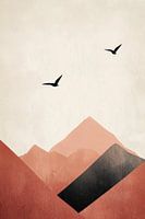 Een minimalistische compositie van gestileerde bergen in warme aardetinten, variërend van terracotta rood tot zacht roze, met een dramatisch zwart accent. Tegen een lichte, serene achtergrond zweven twee sierlijke vogelsilhouetten, die het gevoel van rust en vrijheid versterken in dit moderne kunstwerk.