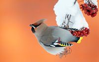 Volwassen Pestvogel foeragerend op bessen in de winter in Finland.