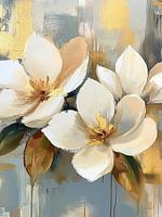 Petal Gold - Dit bloemen schilderij toont grote, levendige magnoliabloemen met uitgesproken witte en beige bloemblaadjes, centraal geel gekleurd, tegen een abstracte achtergrond van grijs, blauw en gouden strepen.