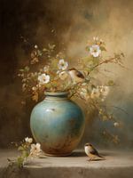 Petal Vessel - Dit bloemen schilderij toont een Japandi-stilleven met een grote turkooise vaas vol witte bloesem en bladgroen, waarin twee kleine bruine vogeltjes speels zitten en op de rand staan, geschilderd in zachte realistische penseelstreken tegen een warme beige-bruin achtergrond — een sfeervol bloemen schilderij en schilderij…