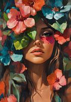 Een olieverfschilderij van bloemen, uitgevoerd in de impressionistische stijl met zichtbare penseelstreken die de dynamiek en levendigheid van het onderwerp vastleggen. In het schilderij zien we een prachtige vrouw wiens haar en delen van haar gezicht zijn bedekt met kleurrijke bloemblaadjes en groene bladeren. Deze bloemige elementen creëren een harmonieuze verbinding tussen de vrouw en de natuur, waardoor ze bijna één met haar omgeving lijkt. De levendige kleuren en de speelse compositie roepen een gevoel van vreugde en energie op, en het gebruik van impressionistische technieken voegt een dromerige kwaliteit toe aan het geheel, waardoor de schoonheid en fragiliteit van de natuur op een unieke manier wordt gevierd.