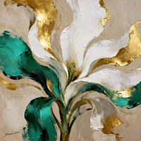 Dit abstracte bloemenschilderij vangt de essentie van de grootsheid van de natuur door middel van gedurfde bewegingen en verfijnde luxe. In het midden van de compositie ontvouwt zich een stralende bloem in vloeiende, expressieve streken, waarvan de witte bloemblaadjes vloeiend en etherisch lijken, alsof ze in beweging zijn. Zachte…