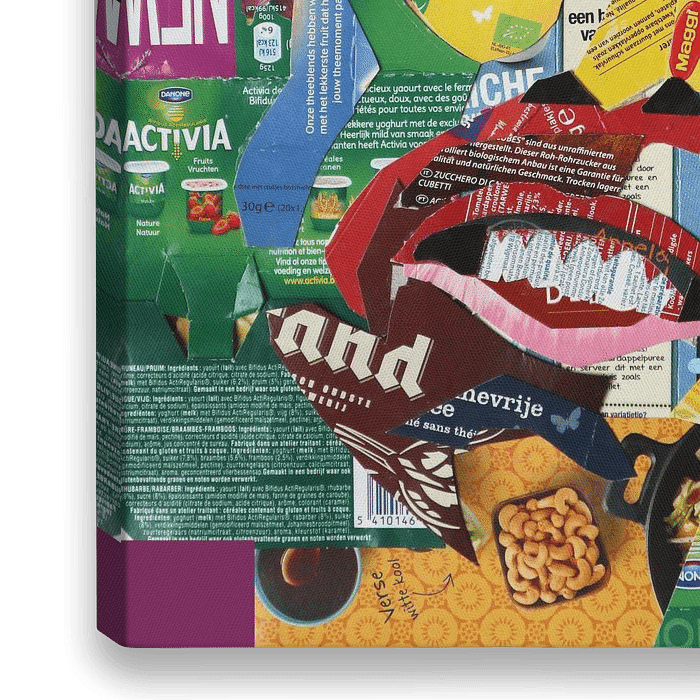 Collage van verpakkingsmateriaal. o.a. koek, yoghurt, thee.