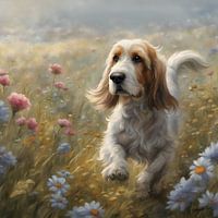 Petit Basset Griffon Vendéen spelend in een bloemenveld van Johannas Art Creations
