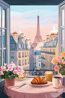 Een sfeervol digitaal kunstwerk dat een intiem Parijs balkonmoment vastlegt tijdens zonsopgang. Door opengeslagen ramen kijkt men uit op de iconische Eiffeltoren, omringd door karakteristieke Haussman-architectuur met mansardedaken. Op de voorgrond staat een romantisch ontbijt met een verse croissant, koffie en sap, omkranst door bloeiende roze rozen, wat zorgt voor een dromerige Franse sfeer.