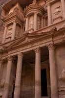 Een kijk op de bekende schatkamer van Petra, gelegen in de woestijn van Jordanië. Dit beeld laat op een mooie manier alle details van de uitgehakte grafkamer zien, tijdens het rustig licht dat je op deze locatie hebt in de late namiddag.