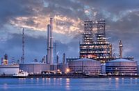 Olieraffinaderij met trein wagons 's nachts