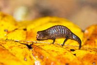 Prachtige opname van de kleinste kameleon ter wereld, de Peyrieras pygmy chameleon (Brookesia peyrierasi) op het eiland Nosy Mangabe in het Masoala National Park, Madagaskar