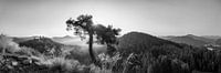 Zonsopgang in het Dahner Felsenland in het Pfälzer Wald in de Pfalz in zwart-wit .