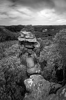 Rotsen in het Dahner Felsenland in het Pfälzerwald in de Pfalz in zwart-wit.