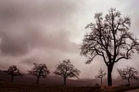 Pfaffenbron in het Noorden van de Elzas. In de ochtend, mist, december, dus kale bomen in de heuvels. Monochroom weergegeven. Troosteloos, of juist mooi?