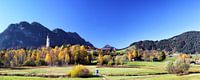 Uitzicht op het herfstlandschap rond Pfronten in de Allgäu met op de voorgrond de Pfrontense parochiekerk St. Nikolaus en op de achtergrond de Kienberg.