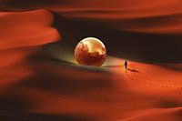Surrealistische fotokunst. Een vrouw vindt 's avonds in de woestijn een lichtgevende edelsteen in een rond ei. Fenomeen,fantasie, oranje,woestijn,futuristisch.