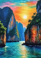 De Phi Phi eilanden rijzen op in dramatische schilderachtige vormen, hun kliffen en wateren gloeien met de rijkdom van zonsondergang. Expressieve texturen snijden de kalkstenen pieken, terwijl de omringende zee stroomt in gelaagde streken die de grens tussen werkelijkheid en droom doen vervagen. De lucht brandt zachtjes met vervagende warmte en omarmt het landschap in licht en schaduw. Dit kunstwerk belichaamt de geest van ontsnapping en avontuur en biedt een tijdloze herinnering aan de adembenemende artisticiteit van de natuur.