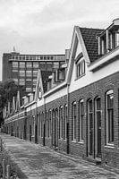 Originele Philipswoningen in zwart-wit. Gerenoveerde woningen in het Philipsdorp in Eindhoven met op de achtergrond de oude Philips Bedrijfsschool. Historisch en monumentaal straatbeeld.