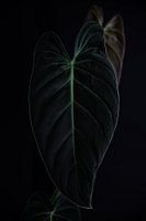 Philodedron Melanochrysum in lowkey gefotografeerd. Een mooi lichtrandje eromheen zodat je contouren ziet van het blad. Op de achtergrond zie nog twee kleine blaadjes van de plant. Deze hoef je geen water te geven en blijft altijd zo mooi. Ook leuk om cadeau te geven voor een plantenliefhebber.