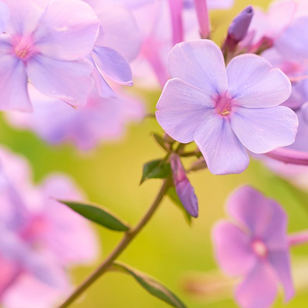 De Phlox, ook wel vlambloem of flox genoemd, is een bekende geurende tuinplant in verschillende kleuren. Deze blauw/paarse bloemen zijn gefotografeerd aan het eind van een warme zomerdag met een heerlijke gouden gloed die over de bloemen en de tuin schijnt. Het zijn kleine, vertederend mooie bloemetjes. Deze foto maakt deel uit van een serie van deze bloem. De pastelkleur van de bloem en de zomerwarmte geven de foto een geheel eigen karakter.