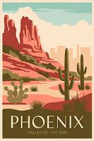 Een harmonieus samenspel van aards rood en zacht groen ontvouwt zich voor een majestueus woestijnlandschap. De opvallende silhouetten van de cactussen en de indrukwekkende rotsen vertellen over de schoonheid van de natuur. Dit kunstwerk past perfect in een woonkamer, waar het een ontspannen, zonnige sfeer creëert.