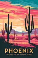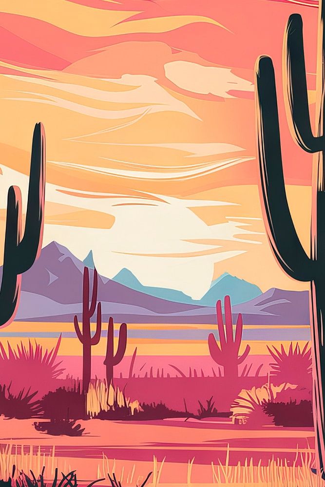 Blauwe en oranje golven van kleur dansen in de lucht en omlijsten majestueuze cactussen tegen de achtergrond van de Sonorawoestijn. Dit levendige kunstwerk straalt warmte en levensvreugde uit, perfect voor in de woonkamer of hal om een uitnodigende sfeer van ontspanning en inspiratie te creëren.