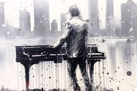 In een kunstzinnige uitspatting van zwart, wit en grijstinten, is de ontembare passie van een pianist gevat tegen de achtergrond van een diffuse stadsgezicht. Druppels die op het doek lijken te vallen, versterken de melancholische sfeer. Dit werk spreekt tot de verbeelding van de beschouwer, waarbij de combinatie van de strakke lijnen van de piano en de organische chaos van de stad een visuele symfonie creëren. Het is een ode aan de muziek die voortvloeit uit de chaos van het leven, een must-have voor de moderne kunstliefhebber die zoekt naar een stuk met diepte en ziel.