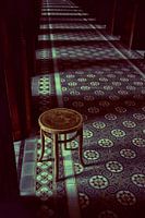 Waar is de piano, wel het piano krukje maar geen piano. Foto is gemaakt in een oud klooster in België. Achter ieder deurtje zat een klein kamertje met een piano en een krukje plus een kastje en 1 groot raam, daardoor mooi lichtval in het halletje.