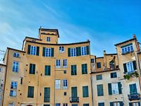 Het levendige Piazza dell'Anfiteatro in Lucca, Italië, is een uniek ellipsvormig plein dat is gebouwd op de resten van een oud Romeins amfitheater. Omringd door kleurrijke historische gebouwen bruist het plein van het leven, met terrasjes, winkels en bezoekers die genieten van de levendige sfeer.