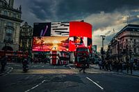 Donkere wolken hangen boven Piccadilly circus in London. De felle neon lichten, de toeristische rode bussen en de mensen geven de drukte in de stad weer. Het is een van de bekendste plekken van London.