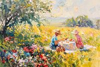 Impressionistisch motief van een picknick in een bloemenweide in de lente.